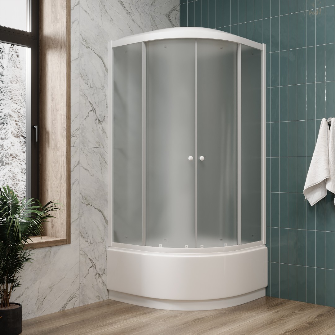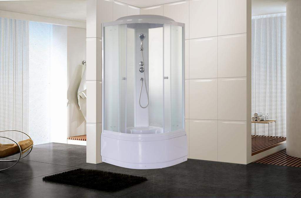 Компактная кабина подойдет для небольших ванных комнат. Светлая модель практична и проста в уходе.